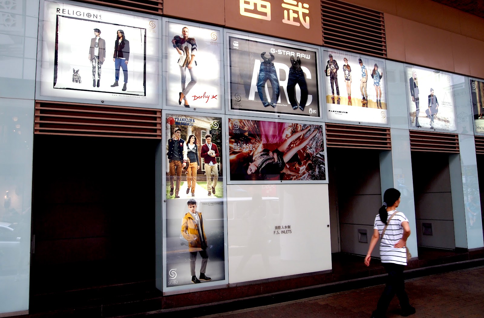Over at Seibu in Hong Kong, they know their stuff about catching their customers' attention. We love their mannequin displays and huge posters, and this is the next step. Lightboxes! Check out the Religion lightbox on the front of the store - even featuring Lucille the Boston Terrier.